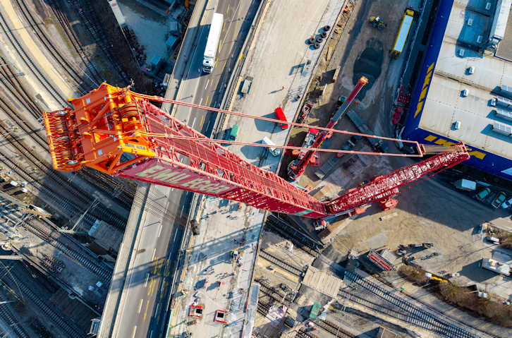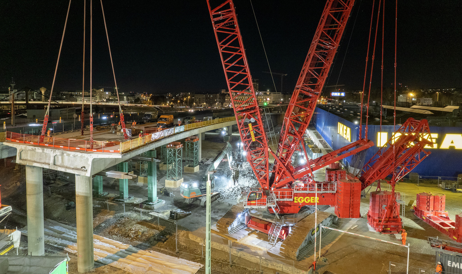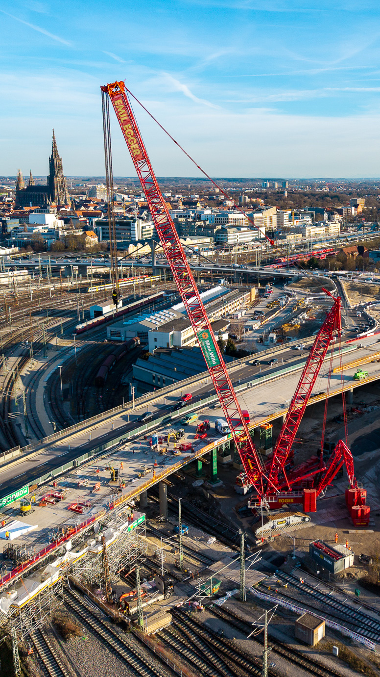 Az idő pedig elsődleges szempont volt az ulmi projekt esetében, hiszen a munkát csak vágányzár alatt lehetett elvégezni, ami komoly fennakadásokat okozott a fontos vasúti ütőér forgalmában, így azok időtartamát a lehető legkisebbre kellett leszorítani. A teljes bontáshoz végül nagyjából hét napnyi folyamatos daruzásra volt szükség, melynek során 52 darabban emelték ki a régi felüljáró szerkezetét – ezek közül a legnehezebb több mint 500 tonnát nyomott.